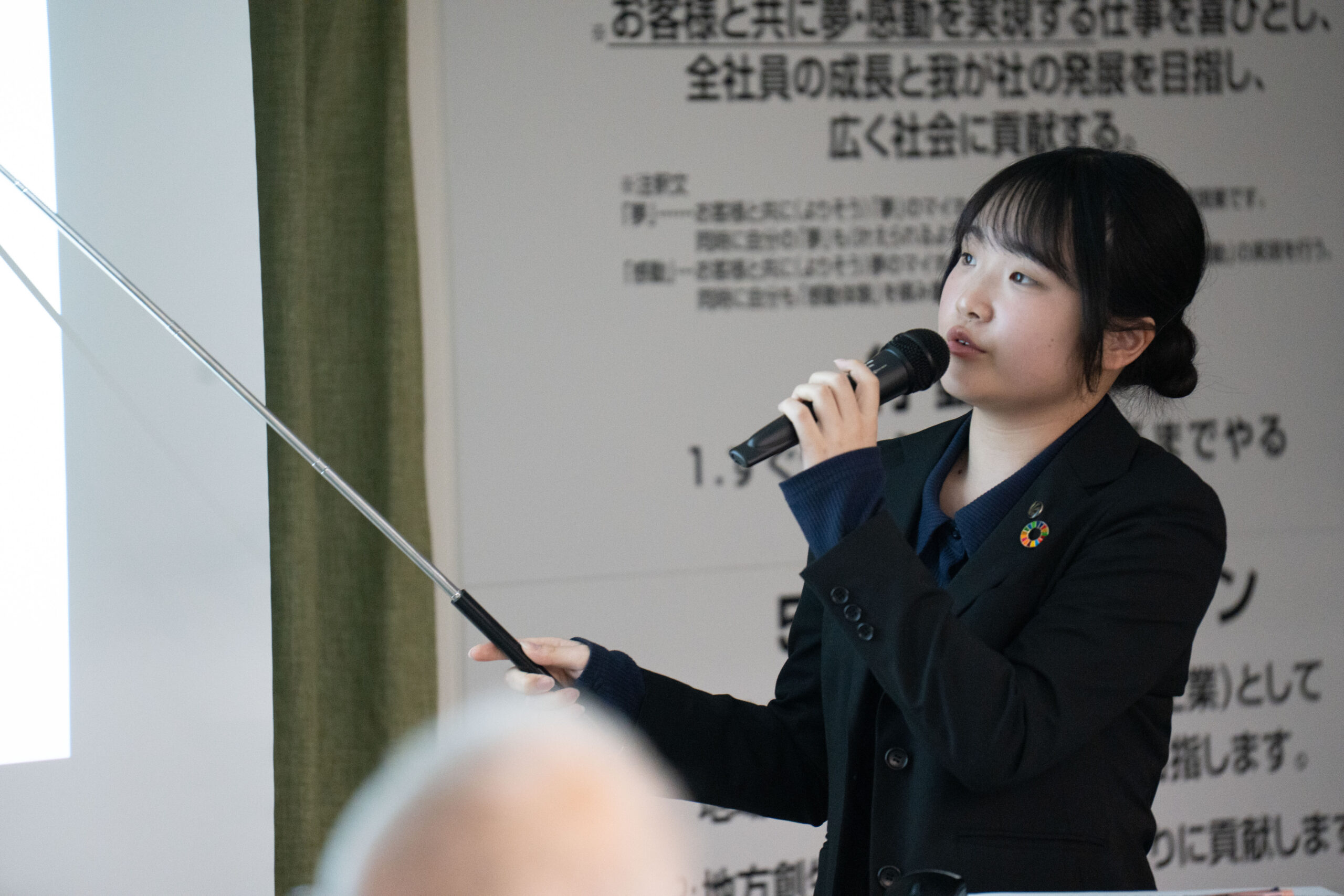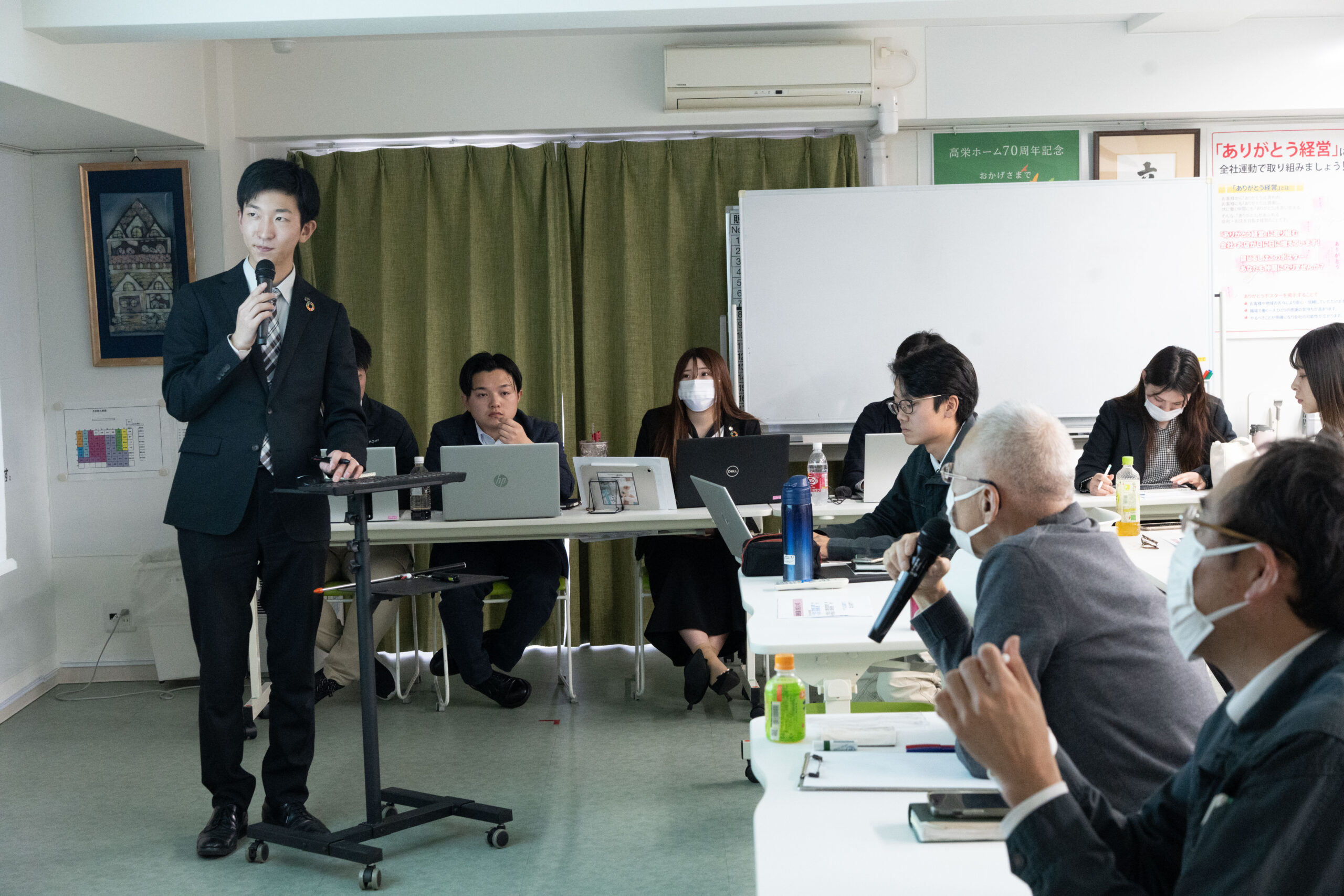 新卒1年目、2年目、中途社員が社長に3か月の成果を発表する場となっています。