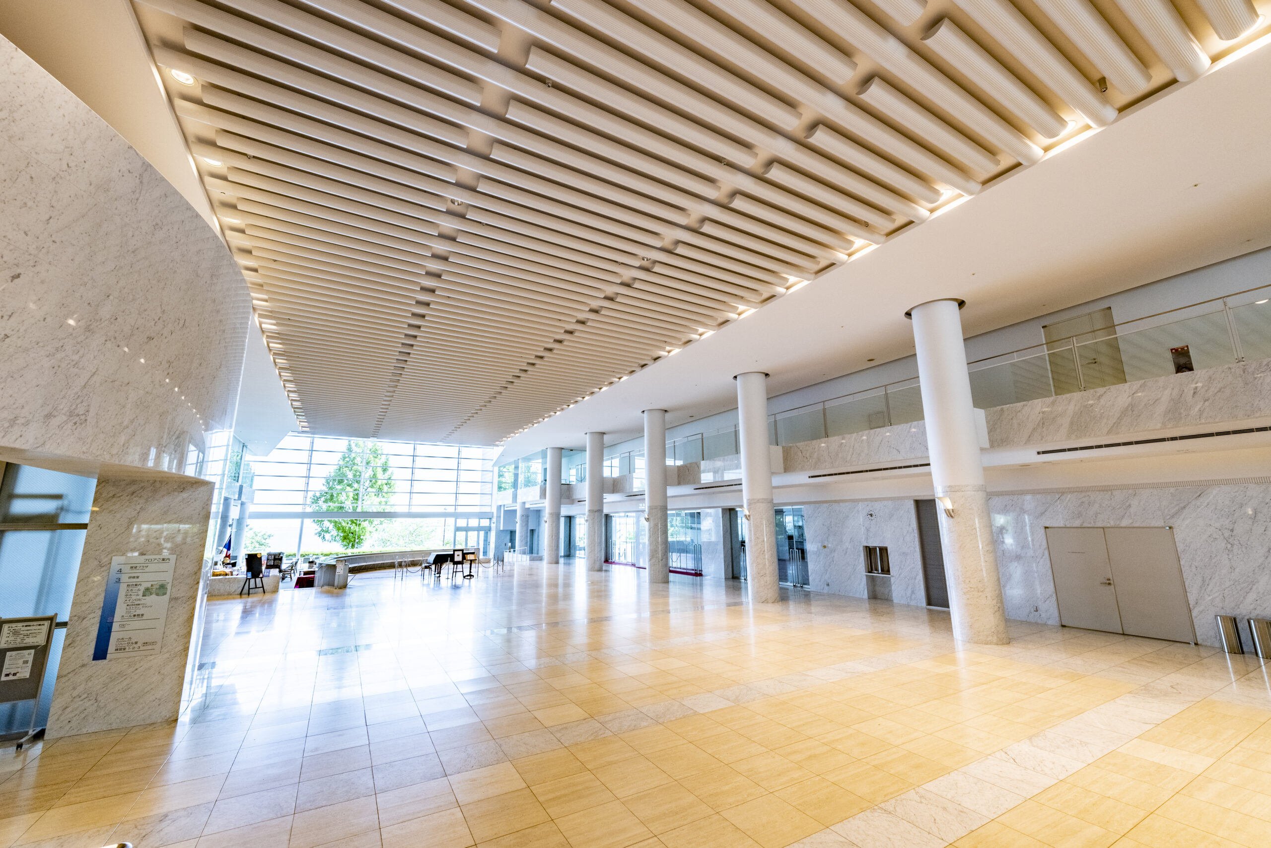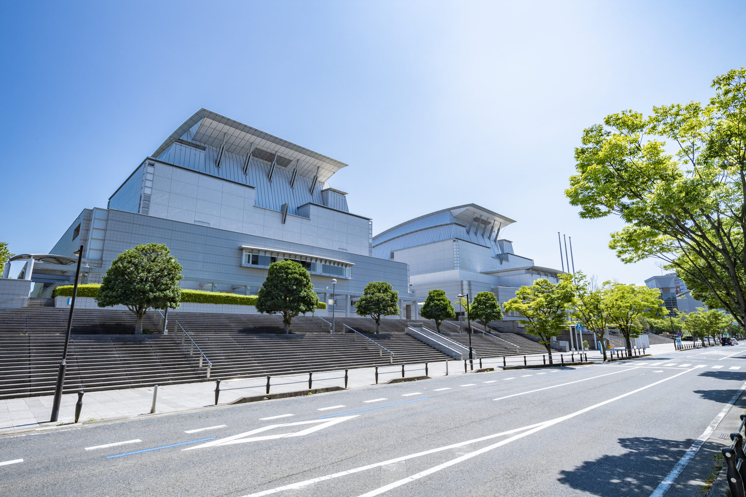 京阪石場駅のすぐ近く、大きな弧を描く2つの屋根のフォルムが特徴的な滋賀県立芸術劇場びわ湖ホール。