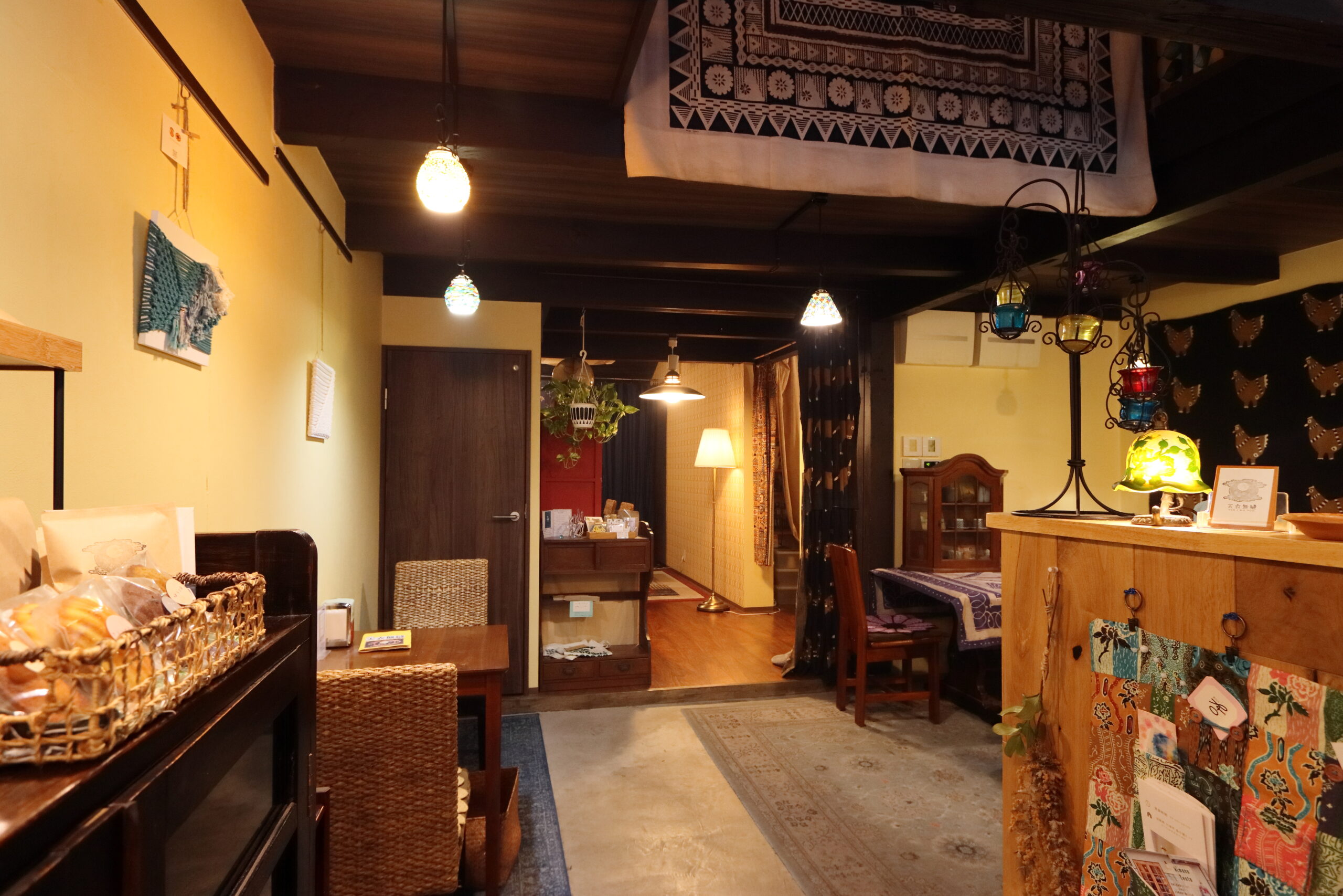 趣ある建物は、かつて店主の祖父が住んでいた築100年ほどの古民家で、その一部を吹き抜けに改装。トルコやフィジーの布、ランプなどを配したエキゾチックな空間が広がっています。