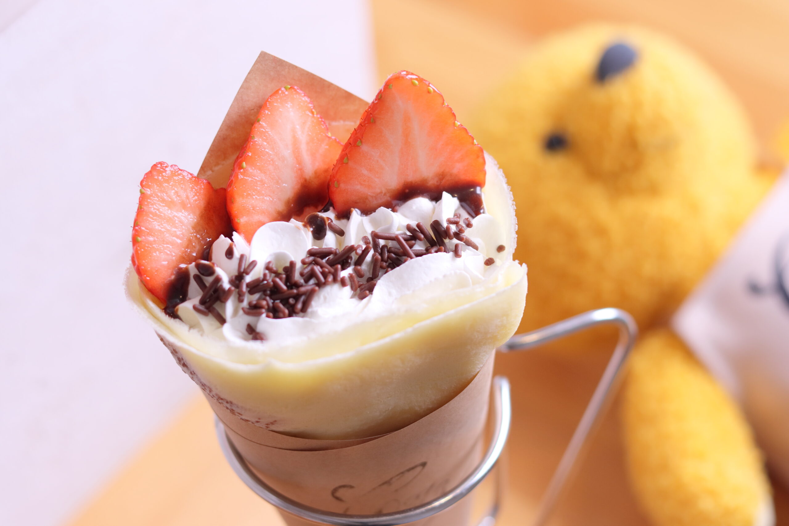 登場を心待ちにするファンも多いという一品で、軽い口当たりの生クリームとチョコソースを生地で包み、上にはイチゴとチョコチップをトッピング。生地も生クリームも甘さ控えめで、イチゴの酸味とチョコレートの甘みが引き立ちます。軽やかな口当たりなので、思わずもう一つ食べたくなってしまうほど。