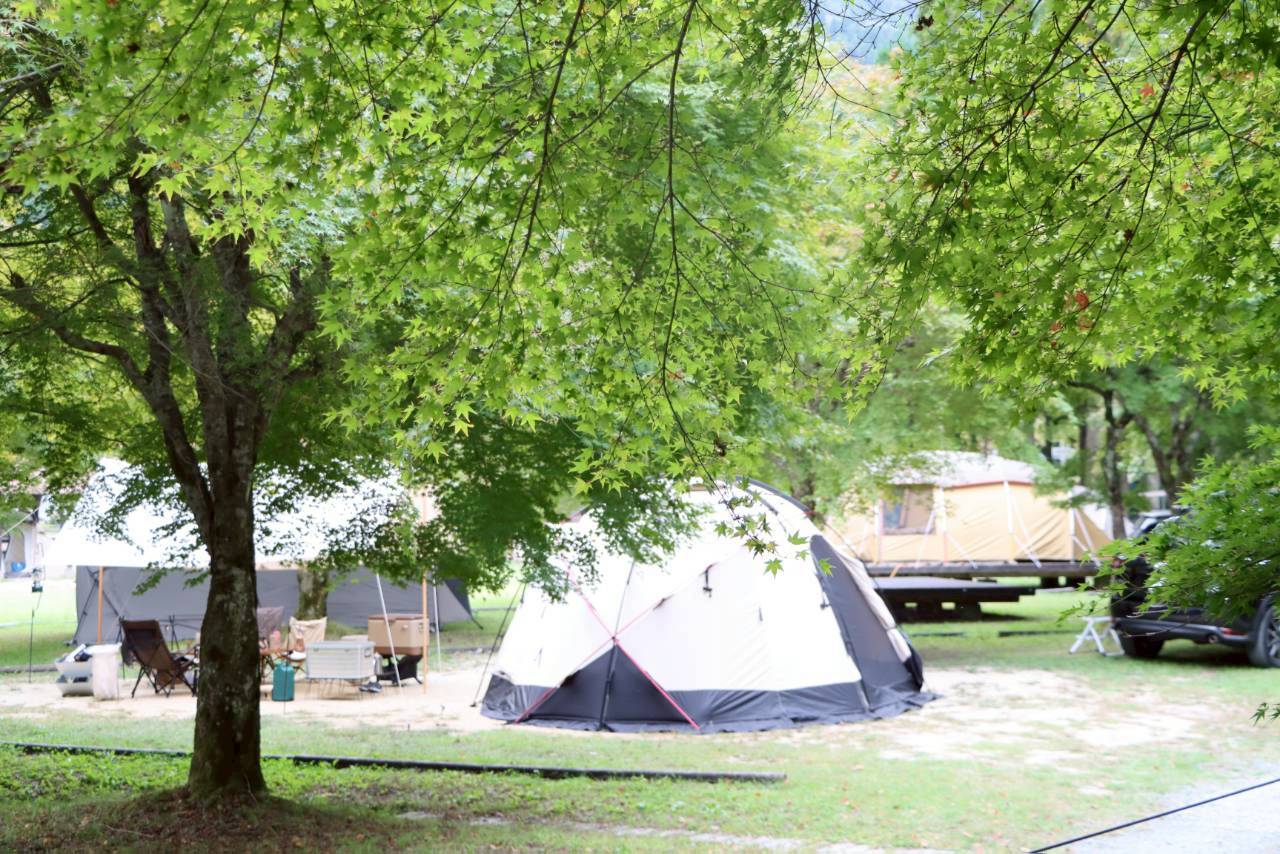 2023年9月にオープンしたキャンプ場は、山々の緑を望む自然あふれるロケーション。木立の中に芝地が広がり、中央には川から引き込んだ人工河川が流れています。