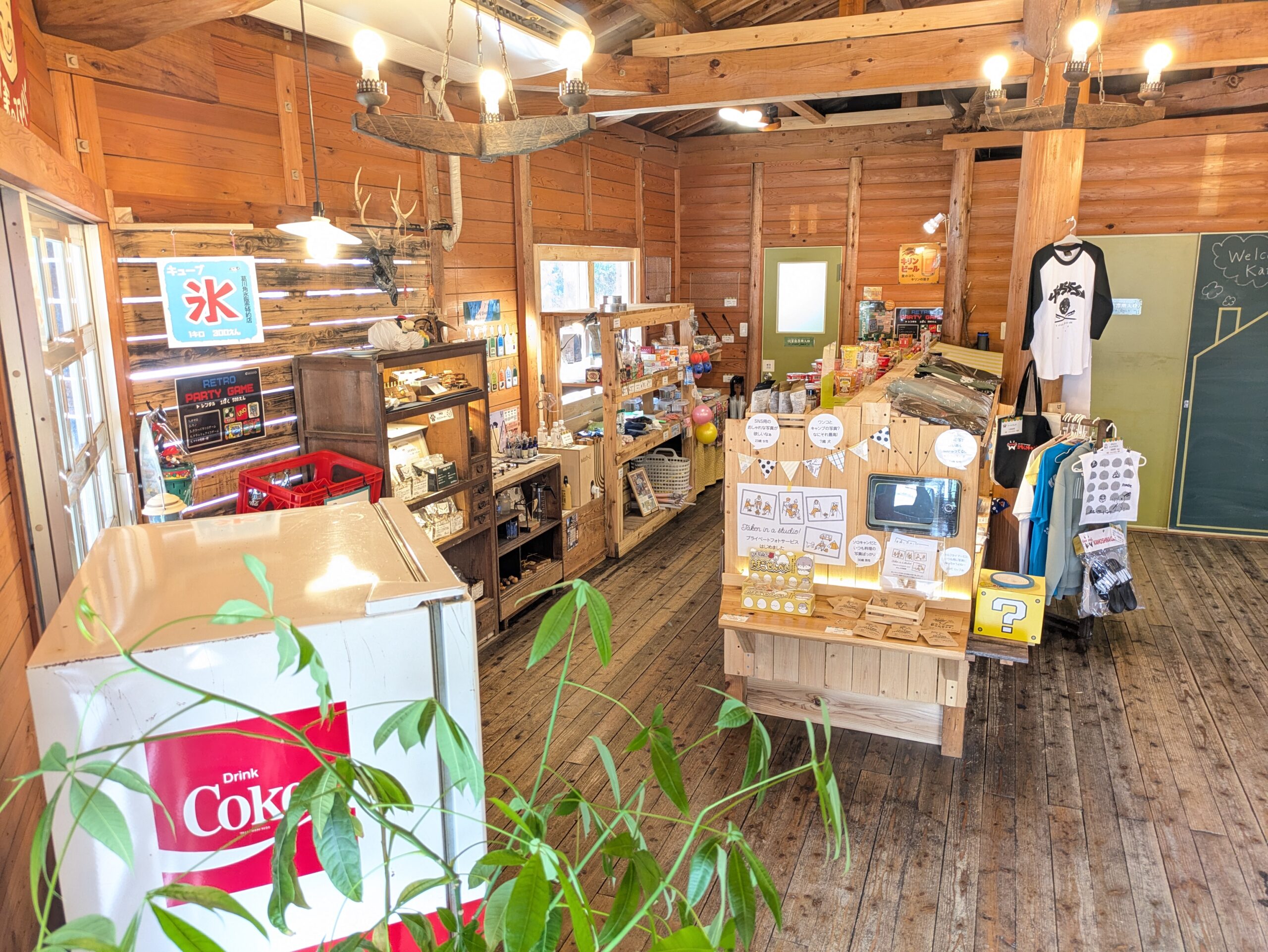 管理棟には売店を併設。薪や着火剤のほか、レトルト食品に調味料、お菓子や飲み物まで、品ぞろえが豊富。
